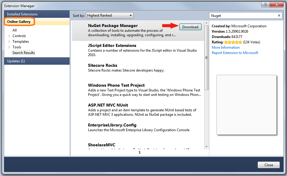 - Under the Online Gallery section, search for "NuGet" and click "Download"